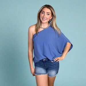 Eesome Royal Blue One Shoulder Dolman Sleeve Flowy Loose Fit Blouse