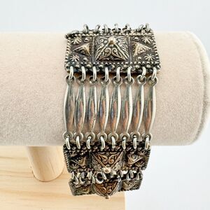 This handcrafted vintage Mexican 925 sterling silver bracelet features an ornate panel design with raised floral and geometric embossing, linked by elongated silver connectors that move fluidly on the wrist. Though one link is missing, it wears beautifully and remains securea testament to its artisanal craftsmanship and enduring character. The piece exudes bohemian sophistication and Southwestern heritage charm, perfect for lovers of vintage silver statement jewelry. Pair it with flowy linen, leather accents, or a crisp white blouse for an effortlessly rustic luxe look. Its warm patina and intricate details make it a standout retro heirloom piece that bridges history and style. Vintage Mexico silver, 925 sterling bracelet, boho artisan jewelry, Southwestern silver cuff, handcrafted vintage bracelet, floral panel design, rustic boho chic, Mexican artisan silverwork, retro statement bracelet, heirloom sterling accessory