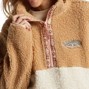 Embrace adventure in this Billabong Women's Horizon Color Block Half-Zip Fleece Pullover Sweatshirt. Made from 100% recycled polyester sherpa, it features a relaxed fit, half-zip closure, and waist pocket. The patterned taping and embroidered branding add a stylish touch to your outdoor pursuits