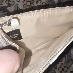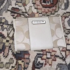 Elegant Coach card holder in cream and tan. Features classic design with zip closure.
