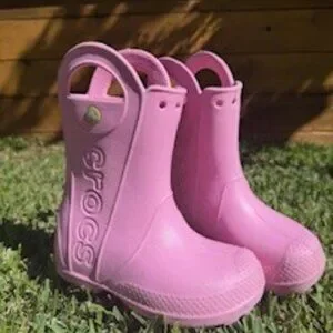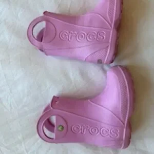 Adorable kids Crocs rain boots in light pink with the classic bucket handles for easy pull-on. Girls size 12. Lightly used condition with gentle wear on soles and a few small scuffs consistent with light use. Recently wiped clean and ready for more puddle jumping, perfect for back to school, playground or general romping.