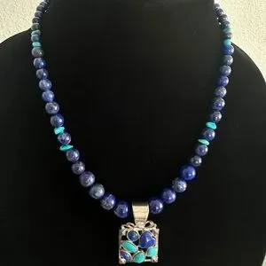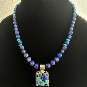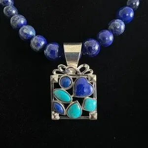Elegant blue and turquoise beaded necklace with a striking pendant. Perfect for adding a pop of color to any outfit.