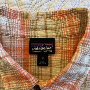 Patagonia Men's Size Medium Organic Cotton button front short sleeve casual shirt. 3" side slits. 100% cotton, machine wash cold. Measures 22" across front from armpit to armpit and 29" in length at center back. No wear or defects and from smoke-free home.
