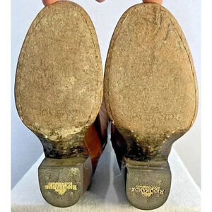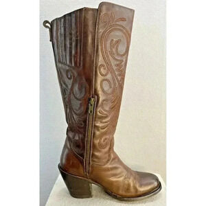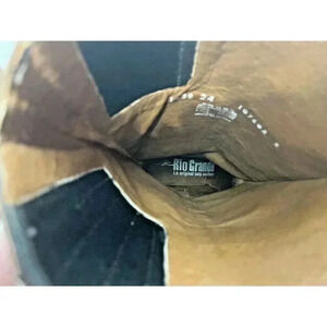 Step out in style with these retired, RARE, sought after, Rio Grande Women's Cowboy Knee High Boots size US 7 or Mexican size 24. Calf measurements 15.5” Made from high-quality leather and featuring a beautiful almond toe shape, these boots are perfect for any occasion, whether it be travel, casual wear, workwear or business attire. The pull-on closure makes them easy to slip on and off, while the regular calf width ensures a comfortable fit for all-day wear. The back upper part (calf area) of each boot also features an elastic band with four leather strips on either side of the rear pull tab These boots have a mid-height heel, measuring between 2-2.9 inches, and come in a solid brown color with stitched and embroidered accents. The outsole and lining are also made of leather, providing durability and added comfort. These boots are perfect for women who want to add a touch of Western style to their wardrobe.