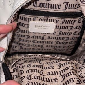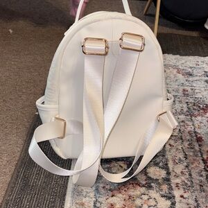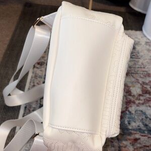 Stylish white backpack with embossed logo. Features front zip pocket and side compartments. Gold-tone hardware adds elegance. NWOT