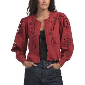 front zip closure, embroidered eyelet design, tassel accent, lattice detail, smocked cuffs, 2 front pockets