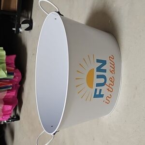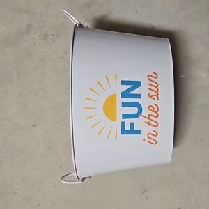 White metal tub featuring a 'Fun in the Sun' design with blue and yellow accents. Perfect for summer gatherings.