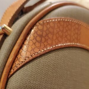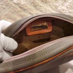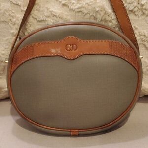 Elegant Christian Dior crossbody bag. Features gray body with brown leather accents. Perfect for any occasion. In pre-owned condition as captured in photos.