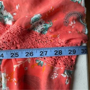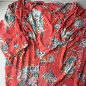 Chic coral kimono with floral and lace accents from Torrid In excellent condition. Loose and flowy. Size 1X/2X. All items come from a smoke free home.