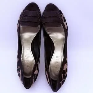 Leopard print fabric upper with dark brown suede accents.