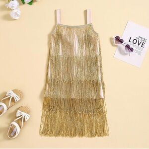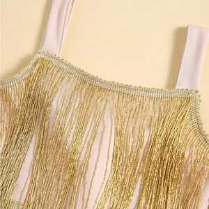 Adorable sleeveless dress featuring layered gold fringe tassels over a nude base for a sparkly, show-stopping look. Perfect for dance, Latin performances, parties, or costume events. Lightweight and twirly with plenty of movement.