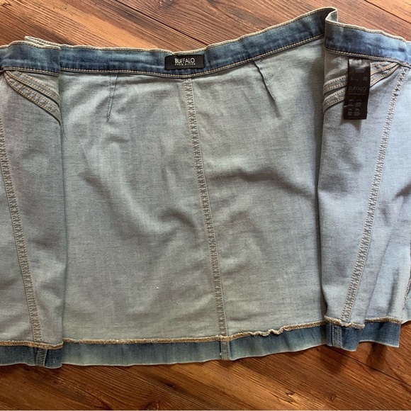 The Buffalo David Bitton Full Zip High Rise Denim Skirt in size 30 is a stylish and versatile piece for any woman's wardrobe. With an acid wash pattern, high rise design, and full zip closure, this skirt is perfect for casual outings, travel, or even a party. Made from denim fabric, it features button accents and a skater style that adds a touch of edginess to any outfit. The brand's reputation for quality and stylish design ensures that this skirt will be a fashionable and practical addition to your collection. Please see photos for condition and measurements.