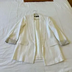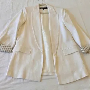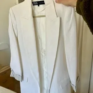 Crisp and timeless white linen blazer from Zara, purchased in Paris and never worn. Features a slightly relaxed fit with sharp lapels, flap pockets, and chic striped cuffs for a subtle contrast. Perfect for spring, summer, or as a polished travel layer.