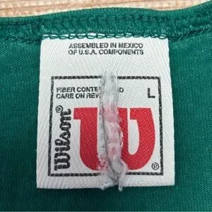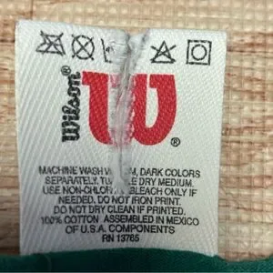 Wilson tag featuring a green trim and bold red logo. Simple and classic design.