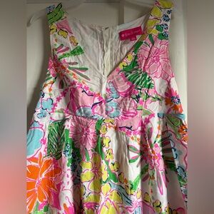 Vibrant floral design. Sleeveless with a V-neck. Perfect for a sunny day.