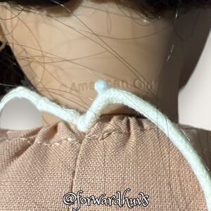 This is a very cute American girl doll who stands 18 inches tall and is marked American girl on the back of her neck. Her eyes open and close (I can’t tell if they close the same or not - they look the same) and she’s wearing gold tone hoop earrings. Her legs are a tiny little bit loose but not significantly, and she has some shiny spots on her legs.