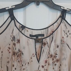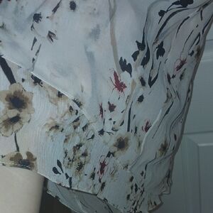 Elegant floral blouse with a layered hem. Features a keyhole neckline and sheer long sleeves. Cool for summer or fall wear.