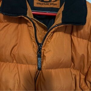 Bold orange puffer jacket by Structure Sport. Ideal for cold weather. Features a cozy design.