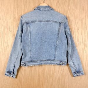 ZARA light wash denim jacket with a relaxed fit and subtle distressing throughout. Features frayed collar and hem for a casual, worn-in look. Great for layering over tees or dresses.