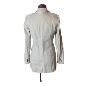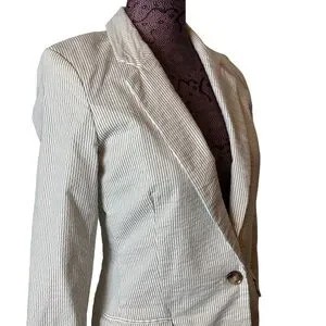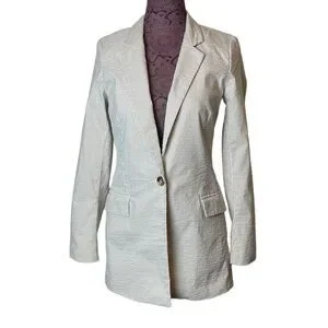 Elegant white blazer with subtle stripes. Single-button closure. Perfect for formal occasions.