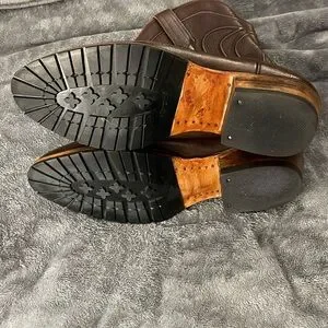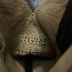 Sturdy brown leather boots with durable rubber outsoles. Ideal for everyday wear. Crafted by Tecovas for quality and style. Leather upper leather sole and leather lining. Not sure if these are brand new or a cobbler put the sole protectors on them for someone but they don’t look worn at all. Size 14D.