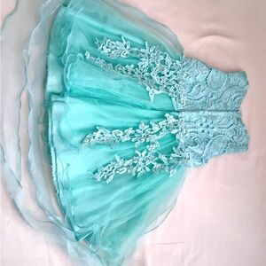 This elegant aqua dress features intricate lace detailing, perfect for special occasions. The soft fabric ensures comfort and style for your little one.