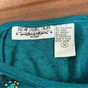 New Direction Woman size 1X teal green top featuring sparkling rhinestone and bead embellishments along the scoop neckline for an elegant touch. Soft, stretchy blend of polyester, linen, and spandex with a relaxed drape — perfect for holiday parties, winter dinners, or festive occasions. Stylish yet comfortable for dressy casual looks.