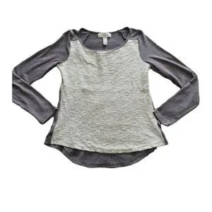 Pretty and unique By Design long sleeve crew neck gray top with cream colored detailing on the front, size small.