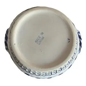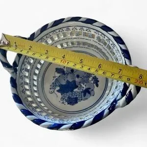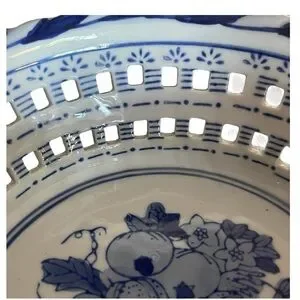 Vintage blue and white porcelain harvest basket bowl with lattice cutouts and twisted handles. Hand-painted fruit design adds cozy farmhouse charm — perfect for shabby chic fall décor or as a unique display collectible.