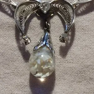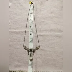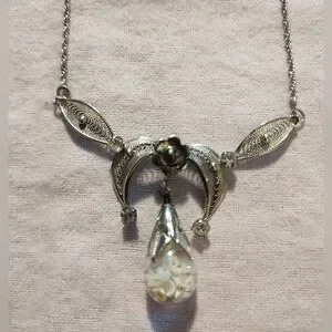 This elegant silver necklace features a delicate floral pendant, perfect for adding a touch of sophistication to any outfit. The intricate design and shimmering silver color make it a versatile accessory for any occasion.