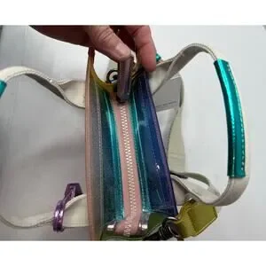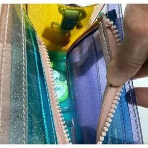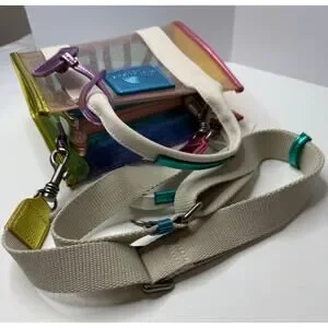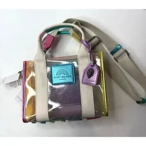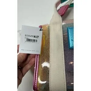 The Extra Small Vinyl Southbank Tote is crafted from a glitter rainbow vinyl. There are metallic trims as well as antiqued silver eagle head with crystals on the tab.