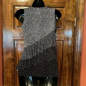Stylish tank top with layered ruffles. Black with white polka dots. Perfect for casual outings.