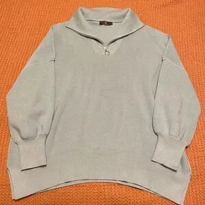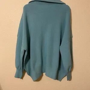 Size large. Stylish blue quarter-zip sweater with a relaxed oversized fit. Perfect for casual wear. First picture gives the best idea of actual color.