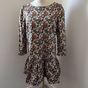 It doesn't get more femme than this floral print mini, featured in a classic cotton fabrication and flattering drop-waist silhouette with ¾ sleeves and ruffled trim.
