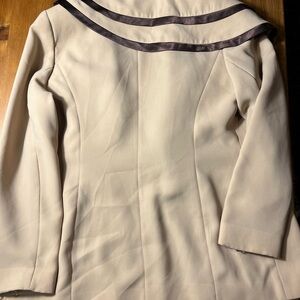 Chic polyester cream blazer with a striking leopard faux fur collar that’s removable. Features elegant dark brown trim accents. Perfect for elevating any ensemble. Has buttons on the inside of the sleeve’s because it has leopard cuffs at one time. Also included is a two toned Dickey. This has such a cool vintage vibe!!