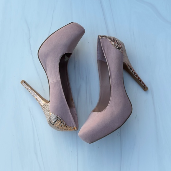The shoes are pink, faux suede pumps with a snakeskin print detail on the heels and platform. They are described as stilettos in a dusty rose color.