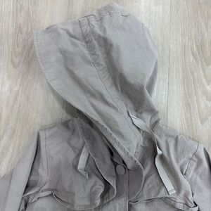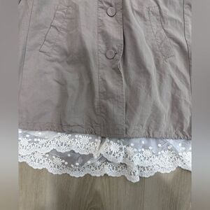 Girls longer beige jacket with bonnet like hood and lace trim around the bottom edge of jacket. Very cute! Great condition.