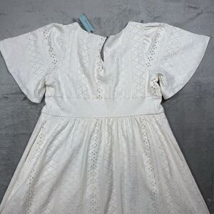 The Maeve Anthropologie Rochelle Eyelet Maxi Dress in size 1X is a boho cottage wedding-inspired piece perfect for various occasions such as travel, parties, and casual wear. Made of spandex and cotton with a knit fabric type, this long dress features a V-neckline, flutter sleeves, and a floral crochet accent. The cream color and fit & flare style with an empire waist add a touch of femininity and bohemian flair to the design. Ideal for the summer, fall, and spring seasons, this dress is lined and machine washable for easy care.