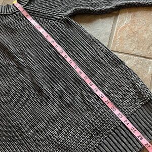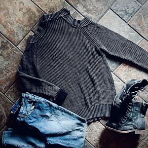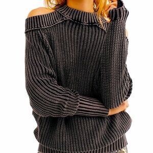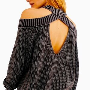 Reminds me of the big ramie cotton shaker sweaters we wore in the 80's. Black distressed with a cold shoulder halter sweater.