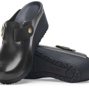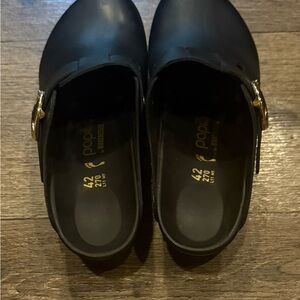 Elegant black mules by Birkenstock Papillio. Features a stylish gold buckle. Perfect for versatile wear. Wore these once but cannot wear because of back!