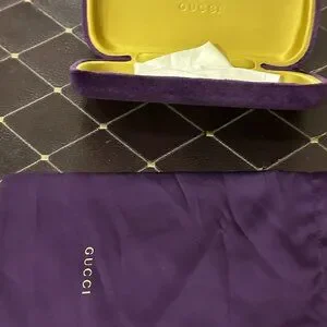 Includes: Original Gucci velvet case (purple/gold interior), Gucci satin pouch, and cleaning cloth