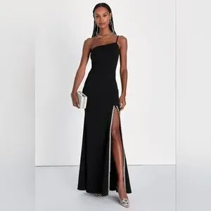 You're sure to radiate with unmeasurable elegance every time you wear the Lulus Absolutely Sensational Black Rhinestone One-Shoulder Maxi Dress! Every curve is sure to be flattered by the stretchy crepe knit composition of this dress, that features a princess-seamed bodice, a one-shoulder neckline (with hidden no-slip strips), and adjustable spaghetti straps. The fitted waist tops a figure-skimming skirt that boasts a mermaid-style silhouette before falling to a maxi hem with a dazzling rhinestone-trimmed side slit. Hidden back zipper/clasp.