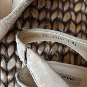 Great condition from high end designer Paul Green. Buttery soft suede and so much comfort. For those who love the Cayanne, this Paul Green style if for you. It features a peep-toe and hidden goring around the back strap for a perfect fit. The stacked heel and soft leather lining make it easy to wear barefoot all day.