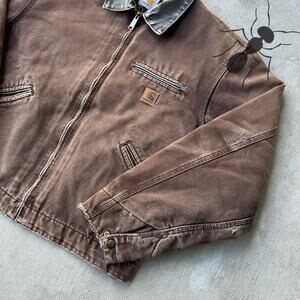 Vintage Y2K Carhartt DKB brown Detroit work wear jacket. Awesome fading on this one! Perfect worn in look. Collar and sleeve torn. Few light stains. Measures 26x26. Please check measurements before purchasing. I do my best to show any flaws in pictures. Quick shipping! Bundles encouraged!