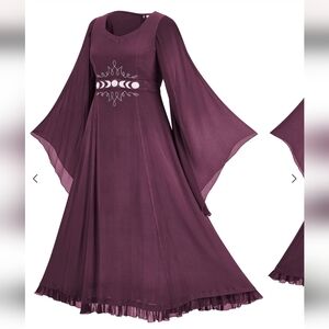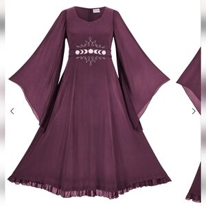 Holy Clothing Selene maxi dark blue Phases of the Moon dress, women's size XL/1X. Beautiful, long flowy dress with semi sheer sleeves. Silver moon embroidery along the waist. Back hidden zipper. Pretty ruffle along the hem. Back tie to adjust the waist. V neckline. Handmade in India.