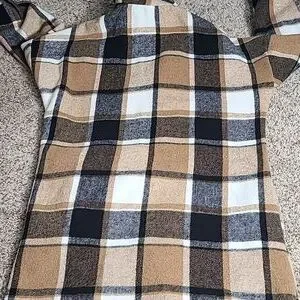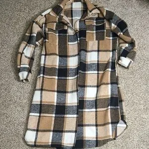 Stylish plaid long shacket in tan, black, and white. Perfect for layering.
