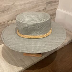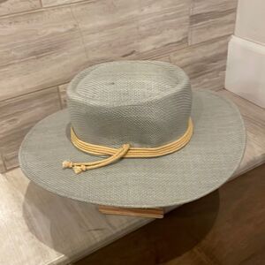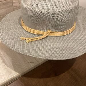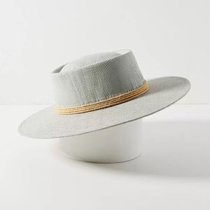 Elegant light gray hat with a stylish tan band. Ideal for versatile wear.
