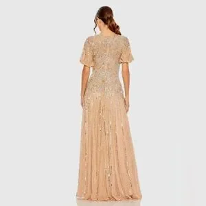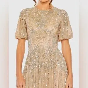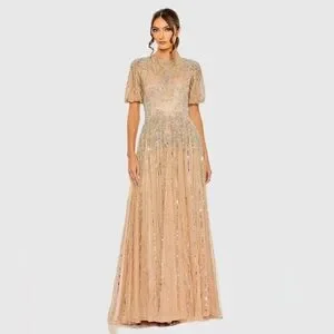 MAC DUGGAL Beige High Neck Puff Sleeve Embellished A Line Gown Size 14 MOB