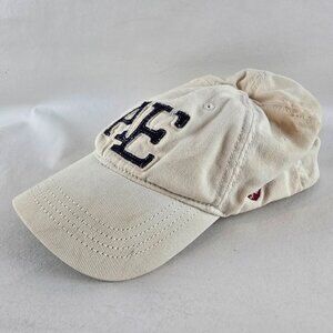 American Eagle Outfitters baseball cap in off white with navy embroidered AE logo. Intentionally distressed for a vintage look. Y2k era embroidered logo. Distressed with some marks/discolorations/stains. Please see all pictures.