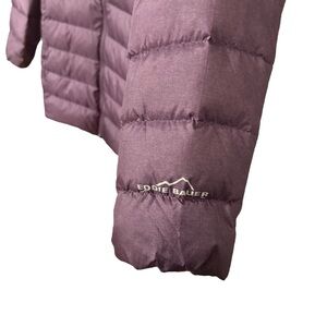 Eddie Bauer EB650 CirrusLite Jacket Women’s Size Medium Plum Purple Packable Down Filled Puffer Coat with Double Zipper, Hooded, Zip Pocket on each Side, Mid-Length Hits Hips.